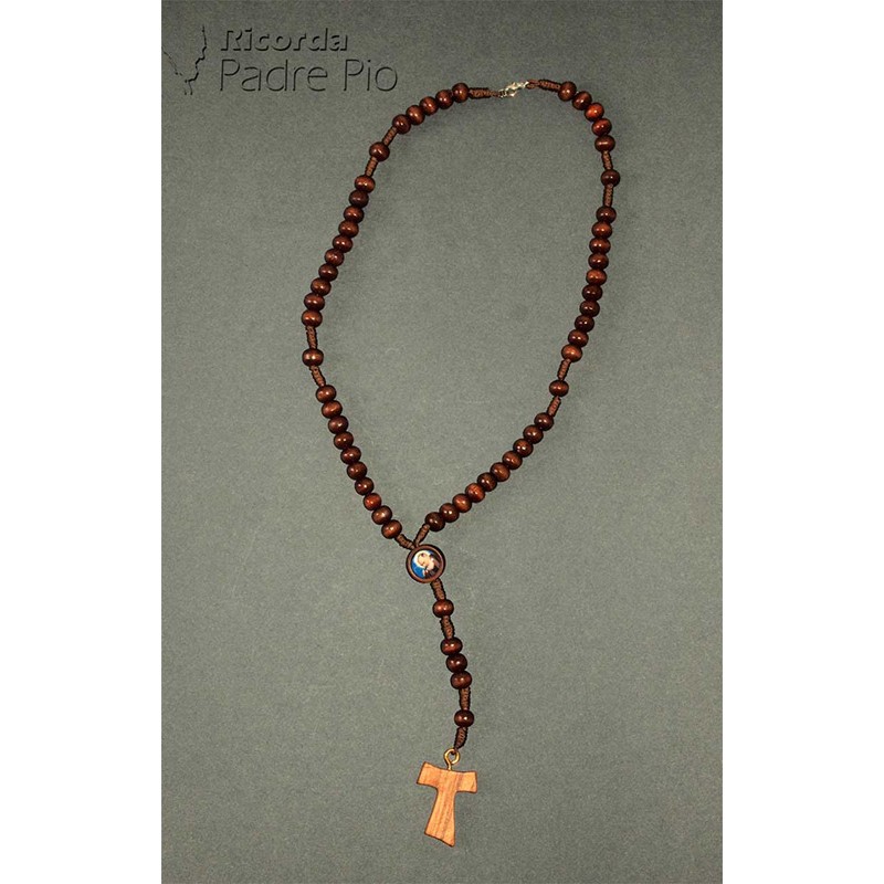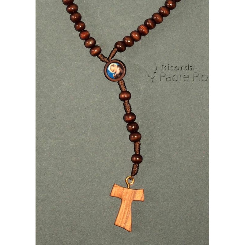 Rosario legno e corda con grani da 6mm , immagine di padre pio e croce Tau